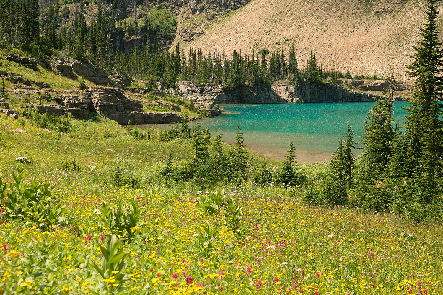 Although I’ve traveled to Montana several times to fly fish, I’ve never managed to make my way to Glacier National Park. As it’s dubbed the “crown of the continent,” expectations were high. We arrived there late in the afternoon when most of the tourists were leaving for the day. The dinner bell and late evening sunlight (it doesn’t start to get dark until 10pm or later here) worked to our advantage, as there was plenty of parking for our oversized van and plenty of time for us to prepare for the quick hike to Avalanche Lake. This is one of the most popular hikes in the park for several reasons: it’s close to the main entrance, it’s short and without too much elevation gain, and it ends at a gin-clear mountain lake nestled in the valley of towering mountains. I took the opportunity to make a few casts for the trout that live in the lake, but was more occupied with my camera as I attempted to do justice to the lake’s beauty.