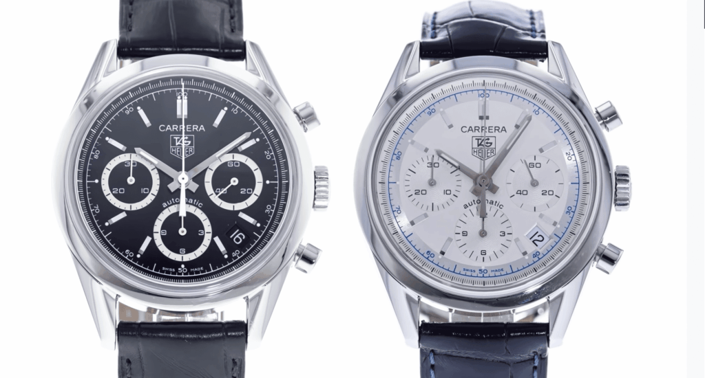 So up first we’re going to look at the TAG Heuer Calibre 17 Carrera. Now that is these two watches right here. We’ve got the silver dial and we have the black dial, and these are an update from the 1996 original 1964 Re-Edition. Now what they did with this is they went ahead and increased the case size from 36 millimeters to the 39-millimeter case size you see here. Still maintains that classic Carrera case design. Angular lugs, a very clean stark dial and now on the inside is the Carrera Calibre 17. And what that is, is that’s basically a ETA 2892 with a chronograph module known as the ETA 2894. And there are people that may poo poo a chronograph module, but it definitely allows for a kind of all-in package that’s easily accessible in its price point.