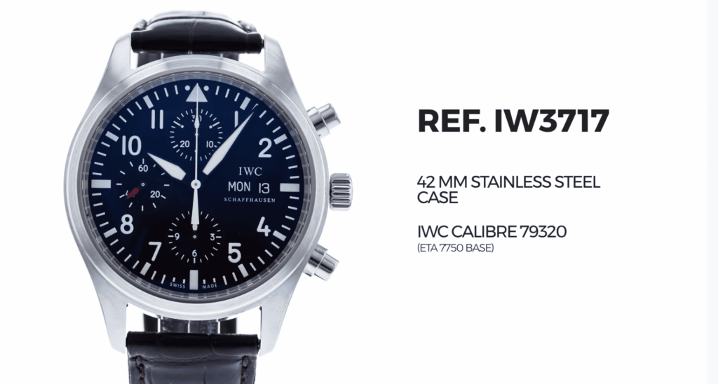 Up next in our alternatives to the Speedmaster Professional is the IWC Pilot’s Chronograph and specifically we’re going to be looking at the IW3717 seen here. Now we went with this one which is a little bit older it’s from around 2010 because of its case size. It’s a little bit smaller than some of the contemporary offerings. Right here this one comes in at 42 millimeters. It’s a little on the thicker side with just over 14 millimeters in thickness but it kind of plays up this aesthetic of being a tool watch. This is very utilitarian. It has a matte black dial stark white indices, stark white hands. It is highly legible, and you can tell that it serves a purpose. Inside it’s powered by an ETA 7750 that has been modified by IWC.