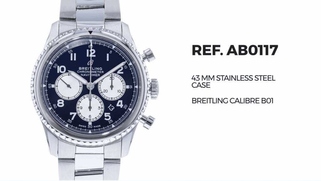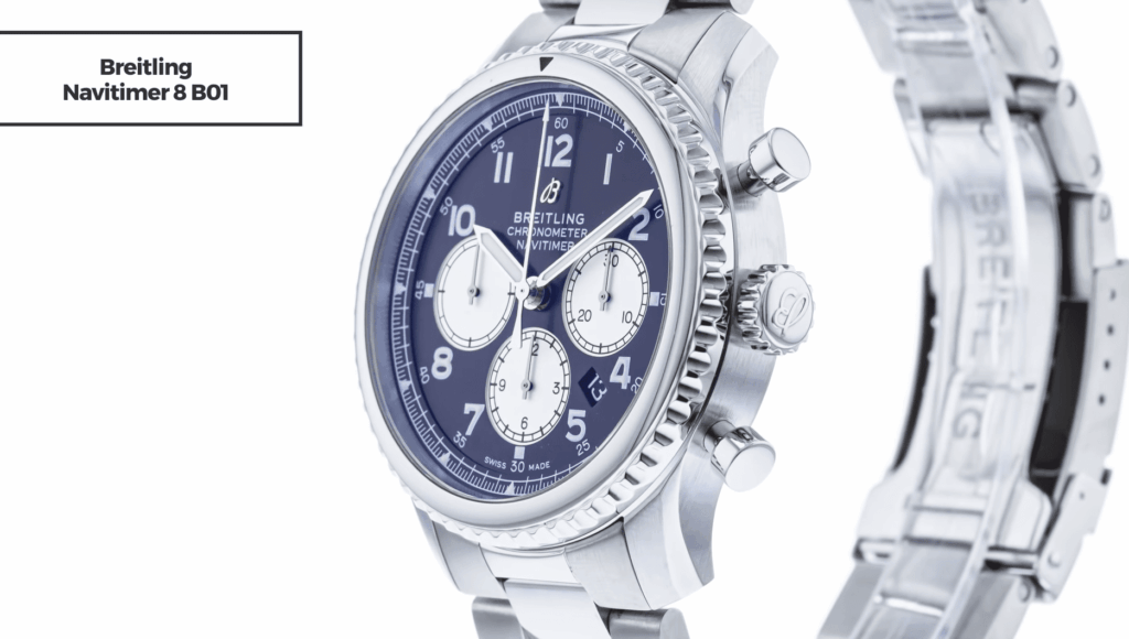 Now ,this example the Navitimer 8 is a 43-millimeter watch coming in right at 14 millimeters thick. So, it definitely is a larger watch. It has plenty of wrist presence if that’s something that you are looking for and internally is the Breitling B01. Now this is a movement that was released in 2009 and is Breitling’s in-house automatic chronograph. Now that’s a big deal and especially at this price point. In-house automatic chronographs don’t come along very often. Daytona would be a perfect example of another one, and this can be had for far less than that and it is a workhorse of a movement. But ultimately what you have is a Breitling that most people may not associate with the brand.