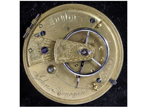Pocket watches were also a part of Ireland’s horological heritage in the eighteenth and nineteenth centuries. Two of the primary watchmakers in the country were the Donegan brothers, John and Patrick. In addition to signing their watches with their respective names, they used the Donegan seal. It featured a shamrock with J and D on the left and right petals respectively. John’s other signature was his use of trefoil hands.