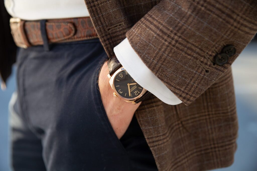 So, how do you wear a rose gold Panerai? Well for starters, the warmth of the rose gold goes well with brown and navy tones. I’ve paired it here with a classic brown check blazer and a crisp white button-down. If you’re looking for a little more versatility, you could also throw this watch on a variety of NATO straps. It’d be the perfect way to change up the look for the warmer months of the year. I found it worked great on a classic military-green NATO, maybe because of its military past.