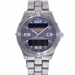 Breitling’s Aerospace line might just be home to the ultimate tool watches. Cased in lightweight titanium and powered by Breitling’s Calibre 75 SuperQuartz movement, the Aerospace pairs analog and digital time displays with additional complications, such as an alarm, a chronograph, a countdown timer, a GMT, and a minute repeater. We love how Breitling retained the classic rider tabs on the bezel.