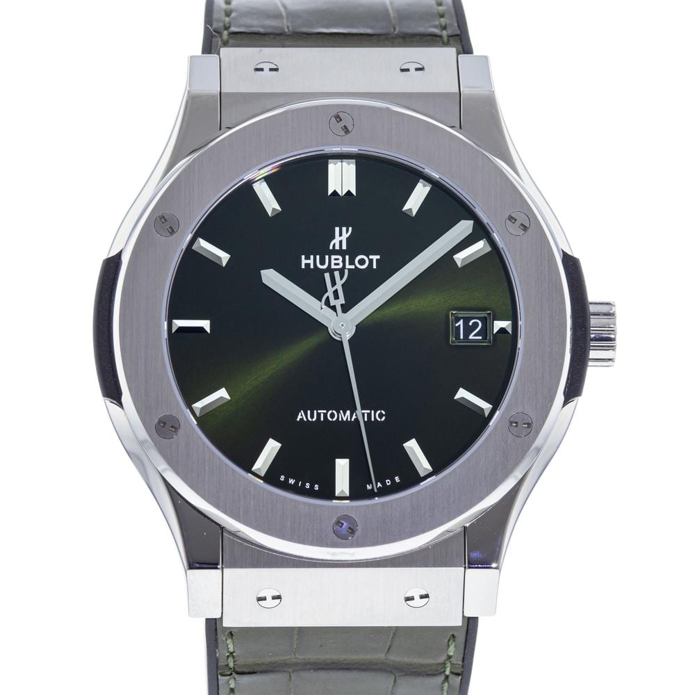 The Hublot Classic Fusion is one of Hublot’s most popular watches. It is a marriage of function and design with a clean look and workhorse of a movement. Though it comes in 45mm it is understated for a watch that large. The green dial and green alligator strap offset a satin and polished titanium case – making it light for the size as well. The Fusion looks so good you almost forget the added complications and massive power reserve.