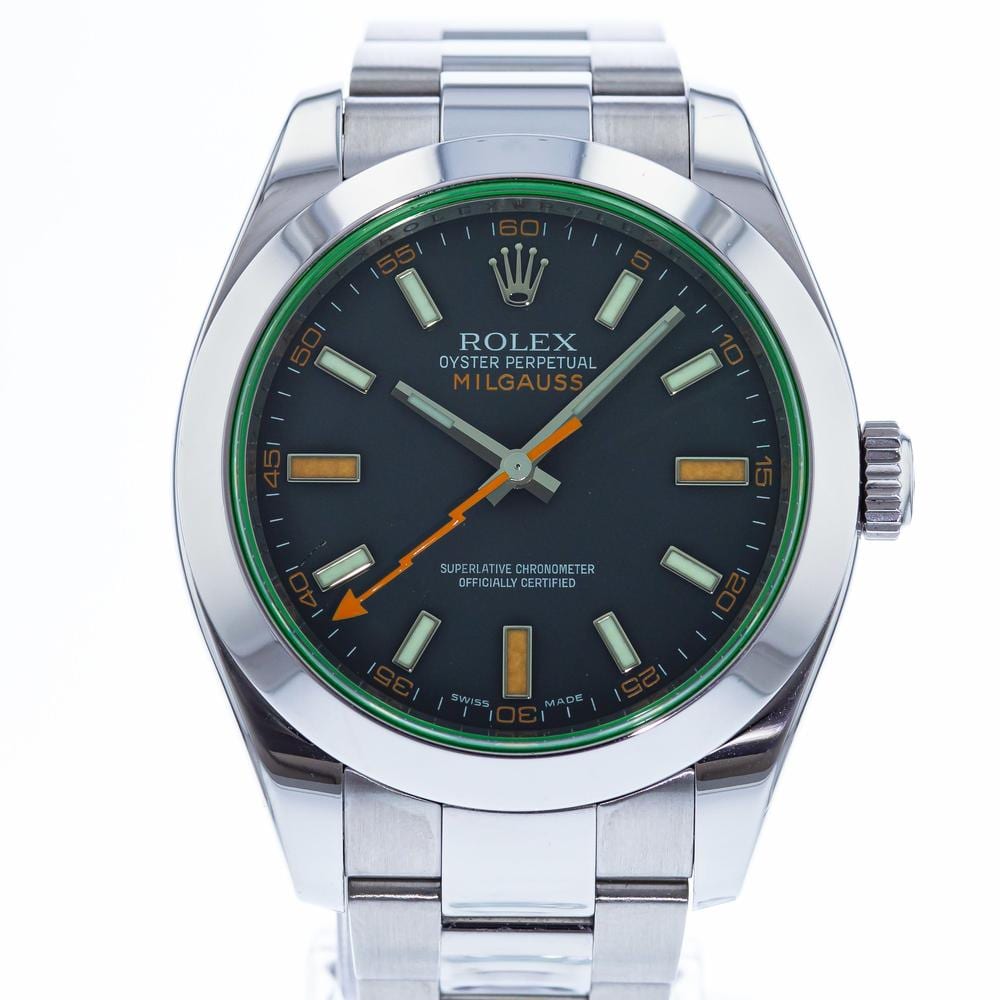 The Milgauss may not be Rolex’s most universally popular model, but it’s certainly one of the brand’s most unique offerings. One of the most notable variations of the model is the distinctive anniversary edition Ref. 116400GV. The “GV” specifically stands for “glass verte,” referring to the green sapphire glass nestled between the stark black dial and polished stainless steel bezel. In addition to the green glass accent, you’ll also find another pop of green once you take this model in the dark. Its hands and hour markers are each treated with a glowing green lume for optimal visibility at nighttime. If you’re not ready to take the bold leap of sporting an all-green dial or bezel but are still looking for a watch with a more subtle green accent, this variation of the classic Milgauss might just be the perfect watch for you.