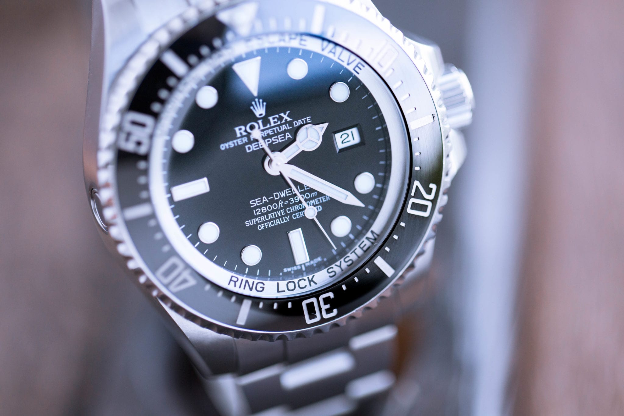 Next up is a function check. The Sea-Dweller has a few complications: the rotating bezel, the helium escape valve, and the winding crown that is so distinct to Rolex. If you’re winding the watch and it doesn’t feel right, then you’ve probably got a fake on your hands. Same with the bezel. With the helium escape valve, make sure it’s an actual functional part of the watch and not just a stamp—poor-quality fakes will cut corners.