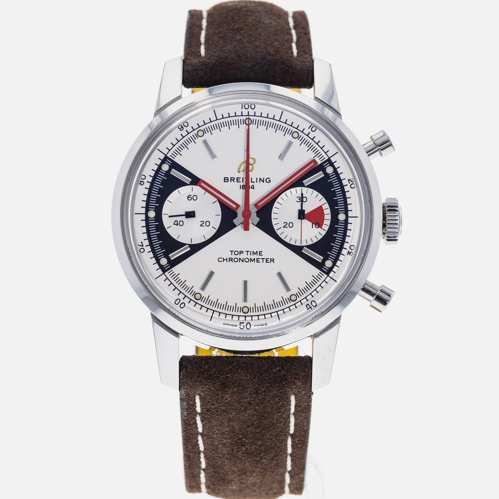Meanwhile, this Breitling Top Time Chronograph has just two subdials. That means it only has a subdial that keeps track of elapsed minutes, on the right of the dial. The left-hand dial is the seconds hand. As the chronograph ticks away the seconds, you’ll see the minute and hour counters start to move forward, keeping track of the time elapsed on that morning run of yours. Once you’ve reached the finish line, simple press the top button to stop the chronograph and you’ll see how much time has elapsed. Then, you can reset the chronograph by hitting the reset button on the bottom so you’re ready to time your next activity of the day (hardboiled eggs, anyone?)