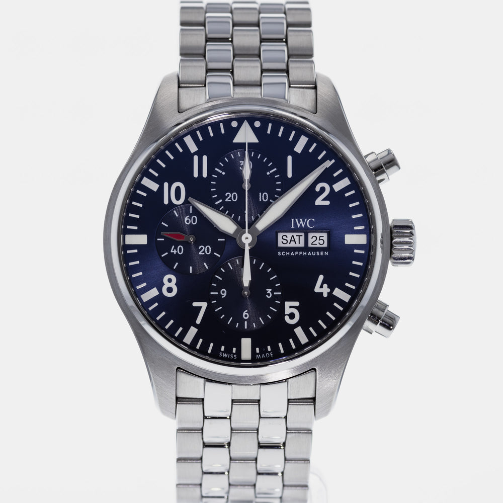 Often, you’ll see chronographs with two or three subdials. Let’s take a look at two different watches to illustrate what these subdials communicate. This IWC Pilot “Le Petite Prince” Chronograph has three subdials. First, take a look at that middle subdial, the one that has a red hand in the middle and counts to 60. That subdial is not a part of the chronograph function; it’s simply the seconds hand like you’d see on most other watches or clocks, chronograph or not. Meanwhile, the subdials at the top and bottom track the total elapsed time of the chronograph: The top subdial keeps track of the minutes (up to 30 minutes), while the bottom keeps track of the hours (up to 12 hours).