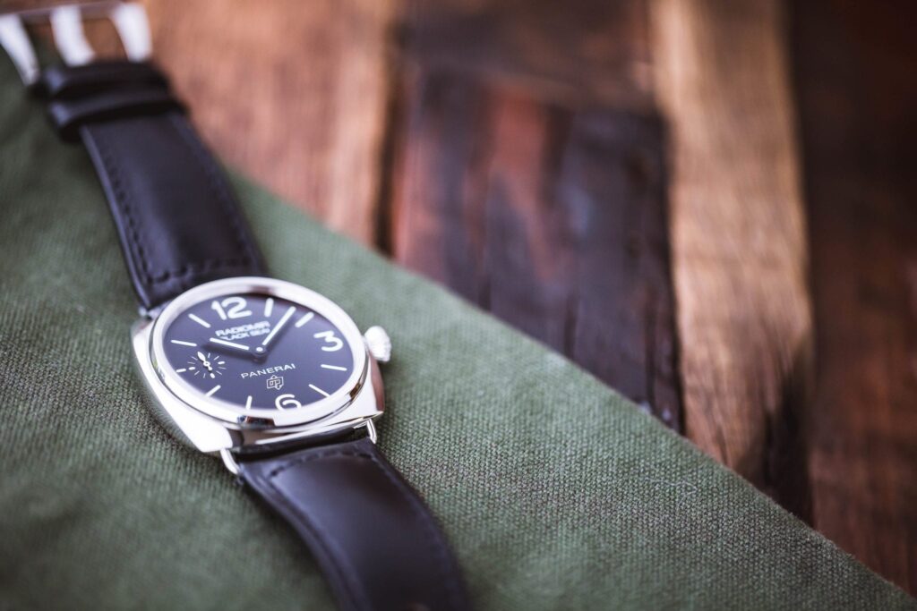 A Panerai Radiomir – Willis has a Radiomir in gold with a black leather band.