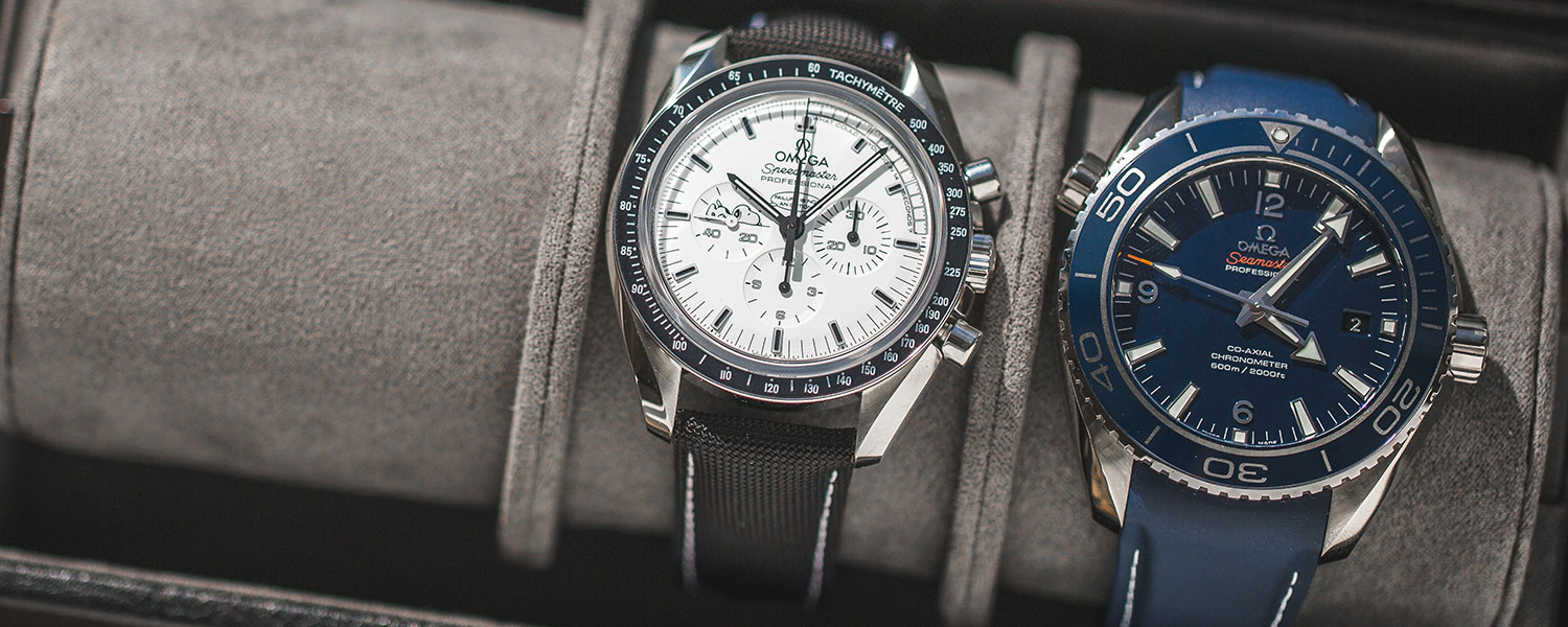 An image of a vintage Seamaster chronograph and a modern Speedmaster