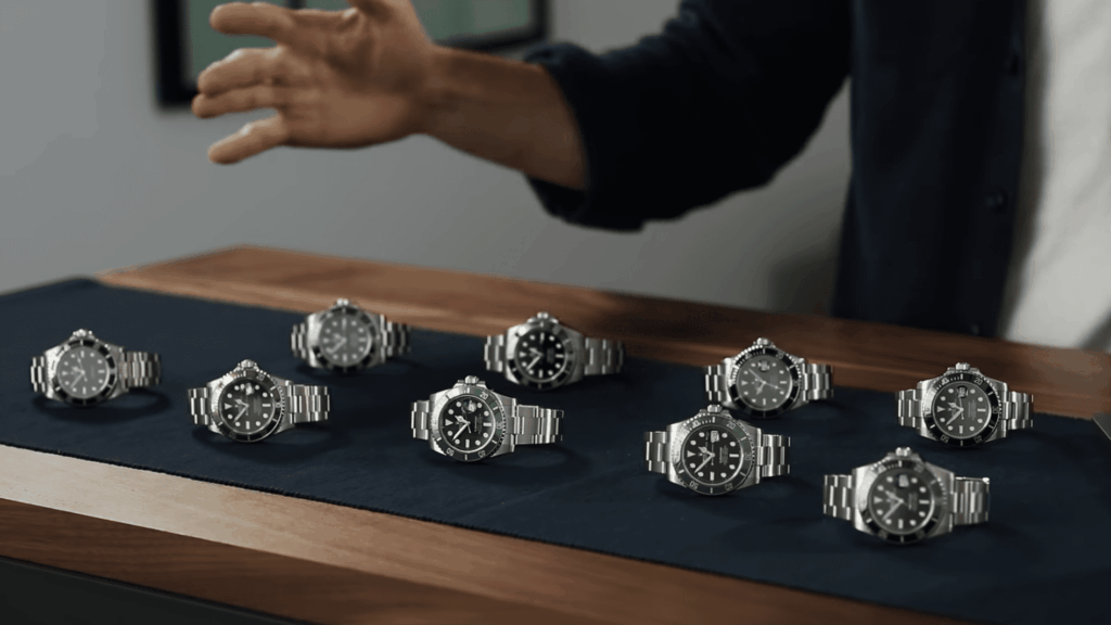 So, here we go. The No Date in progression, the Date Sub in progression and the three anniversary Subs in progression. And this is such a privilege of being able to work here at Crown & caliber. That I get to see all of these watches and hold them and examine them and take an inordinate number of measurements and really start to come up with the differences and kind of create a definitive guide on the current Submariner. And so today what we’re going to do is we’re going to kind of go through these watches and look at kind of the bigger picture because I’ve already taken all the measurements and this time around we won’t focus on that, but we’re going to focus on the differences that have occurred and then also how they wear and ultimately what I think is the best Sub now. So, let’s jump in. Okay so getting started. I’m going to take a breath.