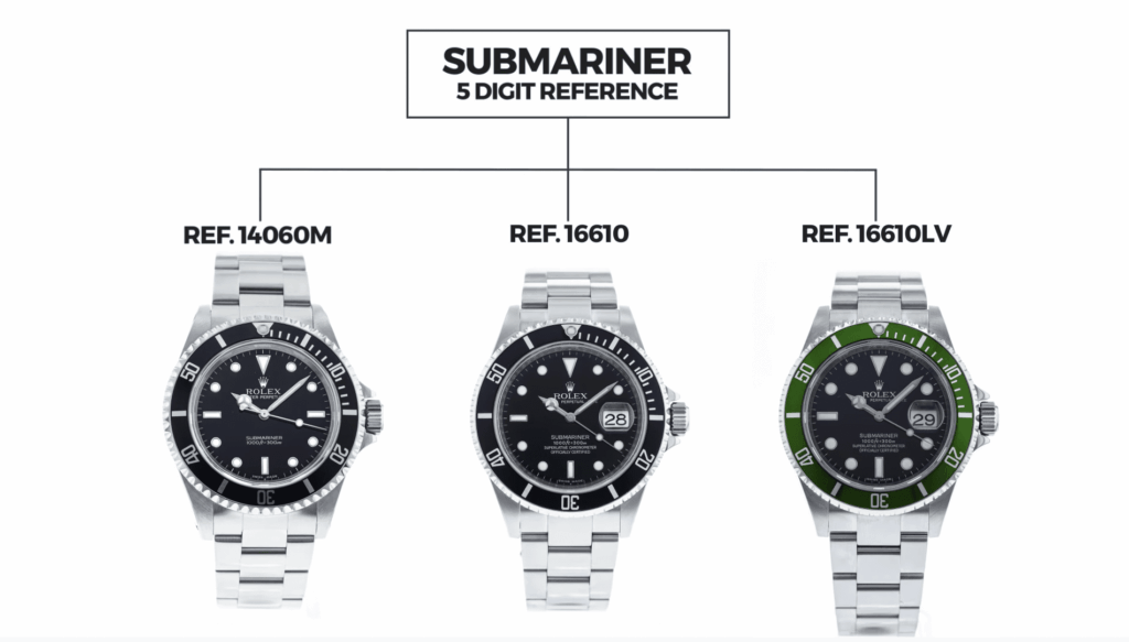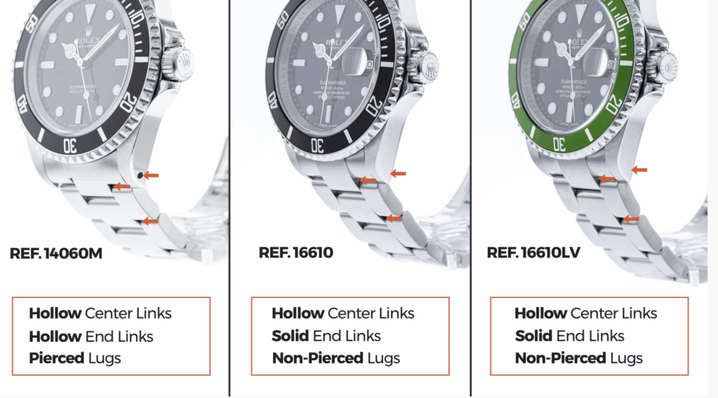 All three of them have hollow center links in the bracelet but in the two date Subs the end links are solid end links so it made for a much more secure fit. Specifically, here we’re looking at transitional references which means the case sides no longer have pierced lugs. The No Date Sub never received the solid end links and the closed off case sides as a five-digit reference. So, just some context and kind of what that watch is.