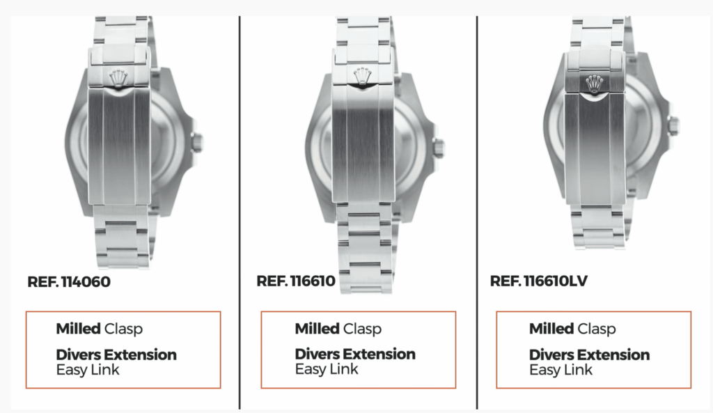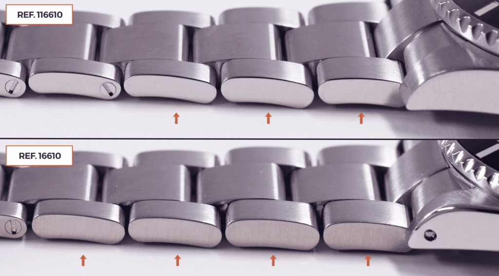 Another interesting point is we’ll go back all the way to the five-digit. So, I mentioned that six o’clock side four non-removable links and that happened to be on both sides of the case. Jump up to the six-digit reference we have now three non-removable links which means you can size the watch even smaller and have a centered clasp on the underside of your wrist. We jump to the newest reference you have three non-removable links on the six o’clock side but now four non-removable links on the 12 o’clock side.