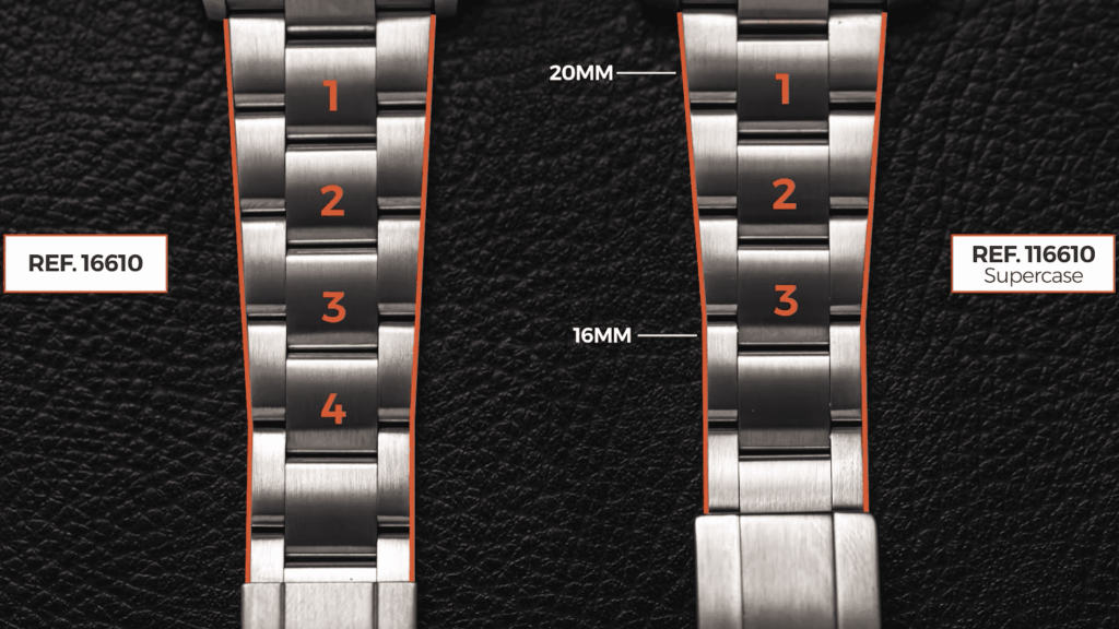 So, for people that have, let’s say it probably starts around a six and a half inch wrist, you could much more easily center the clasp which is a good thing, but what then had to happen is that means that the bracelet had to now taper from 20 millimeters at the lug to 16 millimeters because that is the size of the removable links and it had to do that in one less link. So it had to do it in three links and if you look on the Supercase Submariners the bracelet taper is really aggressive and it almost makes it seem like the heft of the Submariner is going to overtake that of the bracelet and pairing that with these much more blocky lugs makes for some pretty extreme angles.