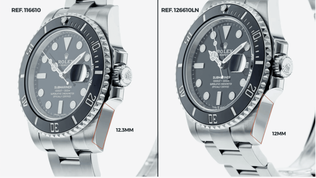 A couple other points. Now that we have a thicker bracelet in a 21-millimeter on the new reference and the outside measurement of the lugs on the newer Submariners is actually thinner, millimeter for millimeter, from the previous Supercase we end up with both visually thinner but actually thinner lugs. So you know there’s probably some margin for error in how I measured things. I tried to be extremely consistent but effectively each lug is a millimeter thinner at its end than the previous generation. So, you have a slightly larger case size. You have physically thinner lugs and with that bigger bracelet it just makes it seem that much more elegant because it is proportionately that much thinner in comparison to its previous generation.