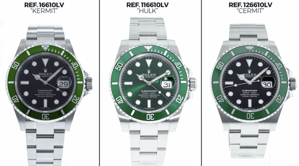 So, that is the No Date Submariner right here the five-digit Date Sub right here and the five-digit anniversary Submariner right here. So, 14060,16610, and 16610LV for the green bezel known as the Kermit. These three represent kind of the end of the line as far as what the sub had looked like for effectively 50 years. And I think what’s really interesting among these three is there’s a lot of inconsistencies. They’re not the same thickness. The size, which we’re measuring from three o’clock to nine o’clock corroborated with six o’clock to 12 o’clock on the outside of the bezel, they are also not consistent. The lug to lug is not consistent. There just is inconsistencies in the size which means that in production there’s just differences. They’re great watches I mean it’s a Submariner.