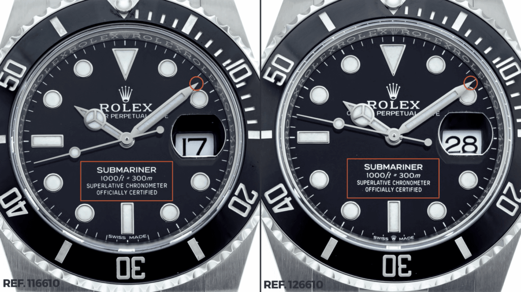 So, I’m still on the fence about what I think visually about this watch but again stylistically I think the sub is definitely a step in the right direction. Like we’ve talked about now between the plain date version and the 124060. I mean these two watches I’ll just say are near perfect. I mean the proportions are great; like I said they wear super well – the black is wonderful. The font on all three of these now is a little bit more bold. And I think in the side-by-sides you’ll notice that all three of these watches the hands have grown. Not only because the case size grew, but proportionally the minute hand now comes all the way to the minute track. The second hand is also a little longer, so the hands just fill the dial that much better.