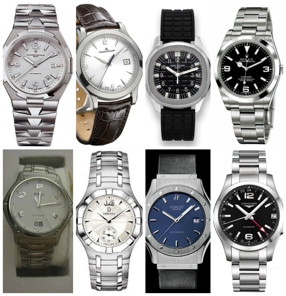 From left to right: Vacheron Constantin Overseas (ref. 47040), Jaeger LeCoultre Master Control (ref. Q1398420), Patek Philippe Aquanaut (ref. 5065), Rolex Explorer (ref. 214270), Ebel Classic Sport (ref. E9125241), Concord Saratoga (ref. 310919), Hublot Classic (ref. 1910.1), Longines Conquest (ref. L3.687.4.56.6)