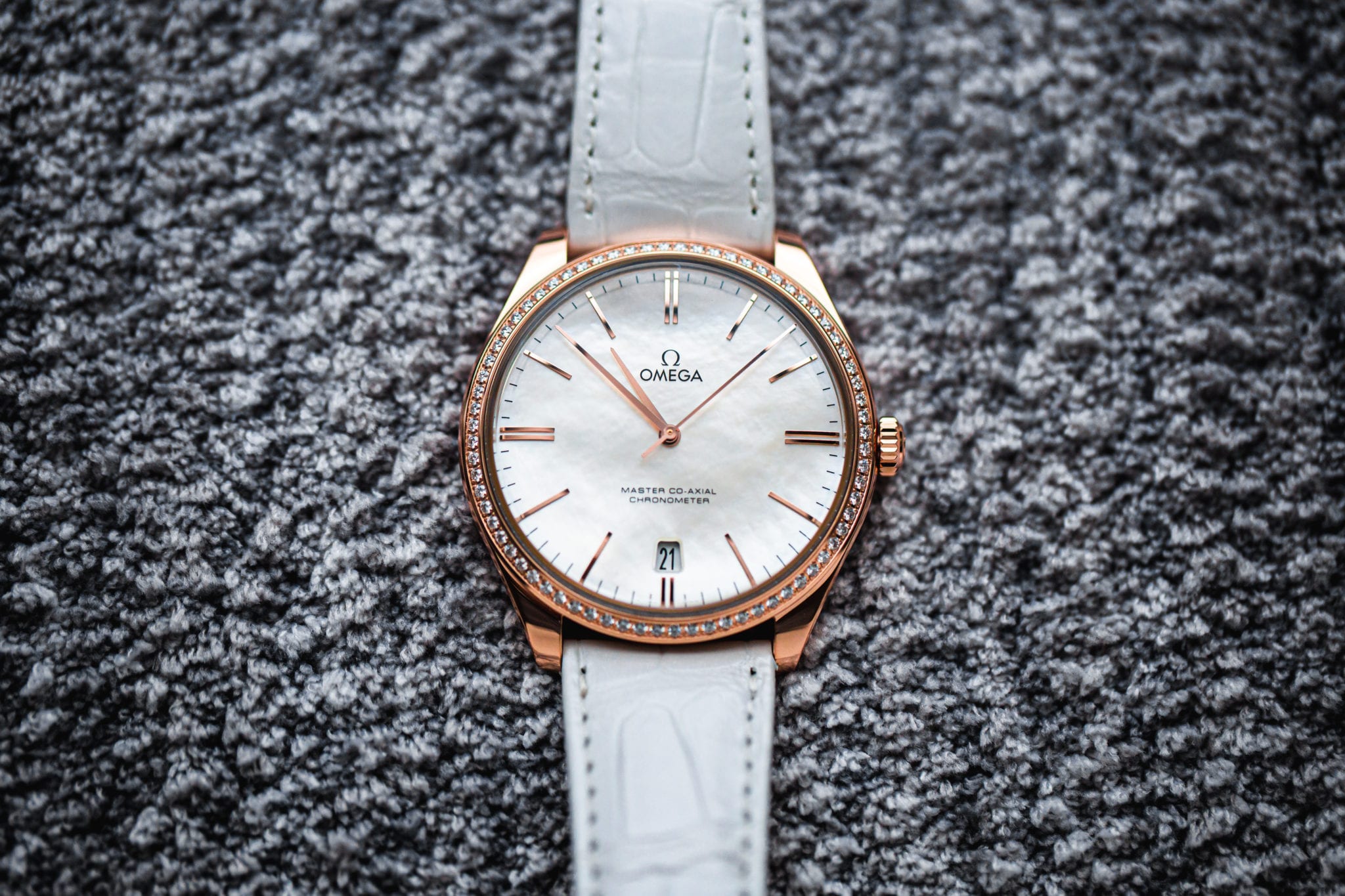 In contrast to OMEGA’s traditional sport and tool watch offerings, the De Ville Tressor is a luxurious dress watch. The Tresor variation of the brand’s De Ville collection offers a more contemporary design with oversized proportions and sleek lines. This particular variation features a mother of pearl dial with simple stick hour markers. A diamond set bezel surrounds the otherwise minimalist dial for just the right touch of flair.