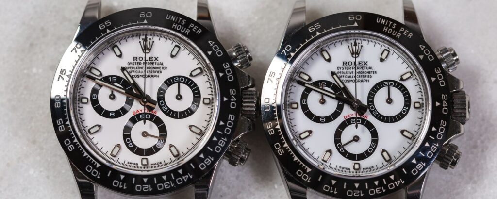 The Rolex on the Left is Fake and the one on the Right is authentic, it is important to go to a trusted seller who can spot the difference and is honest