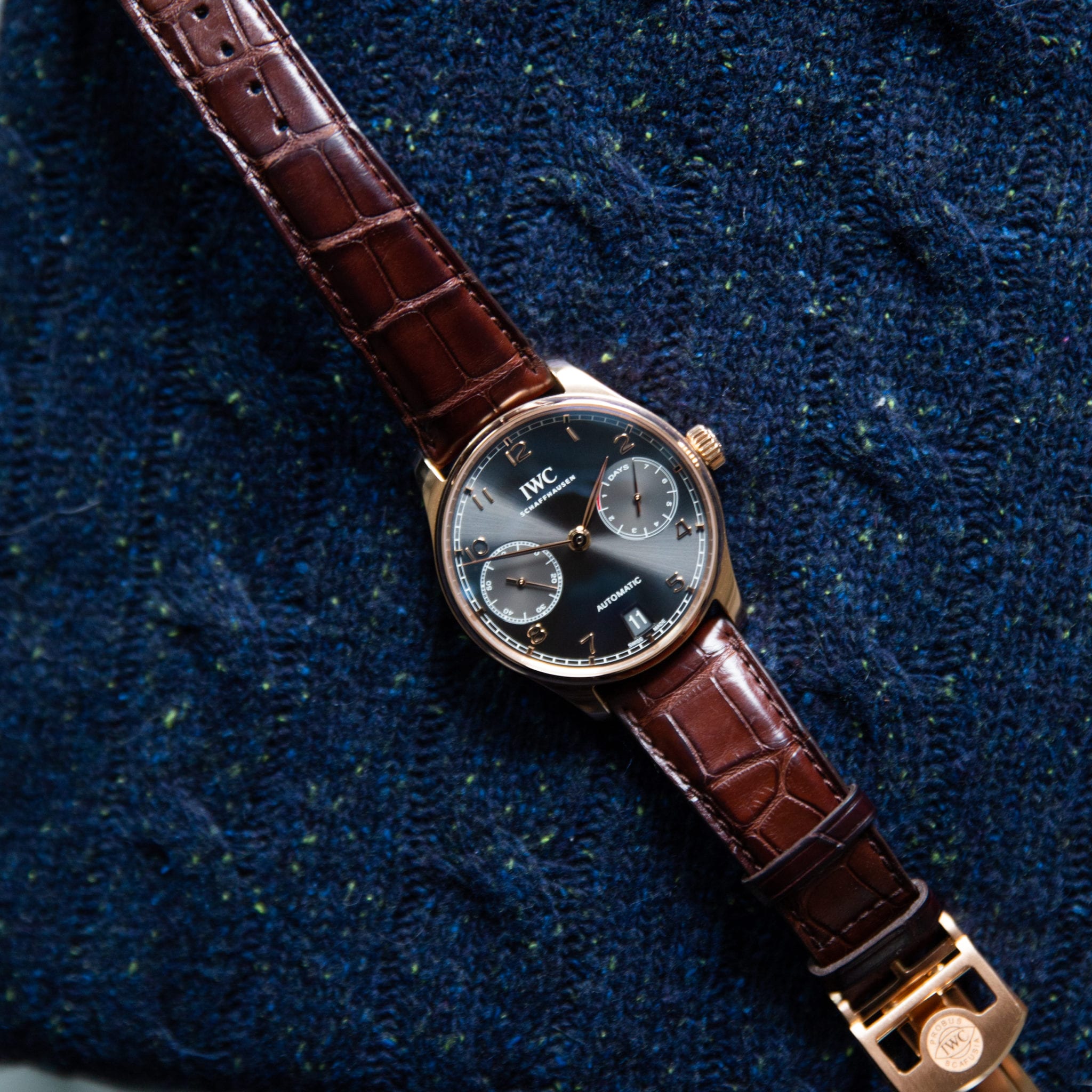 While I wouldn’t pair this with sweatpants, the Portuguese goes well with far more than a suit. I found it to match just as nicely with knit sweaters and chinos in an everyday setting. Of the design elements, the 42mm sizing gives you the freedom to wear the watch in a variety of settings. Still, for those dressier occasions, at 14mm thick, the watch can fit under looser dress shirt cuffs with ease. For all the instances you might reach in your collection for the Portuguese, this model, to me, really shines in business causal with your favorite blazer and casual trousers. The case material alone makes it a great talking point. That warm, rose gold it is far more eye-catching than the stainless steel variations of this watch.